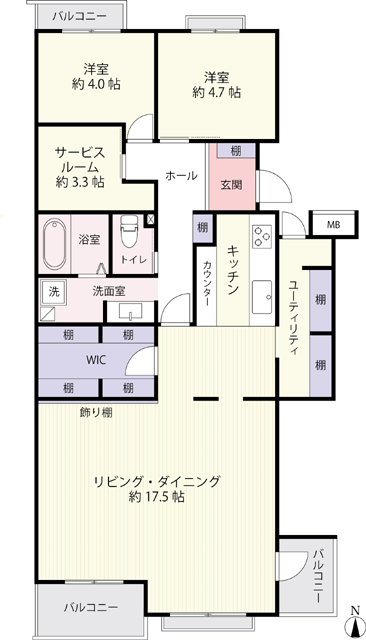 サービスルーム3.3畳と洋室4畳の間の間仕切り壁の上部には約30p×150pの開口兼明り取りがあります。ワークスペースやお勉強に集中できるお部屋としても使用できます。